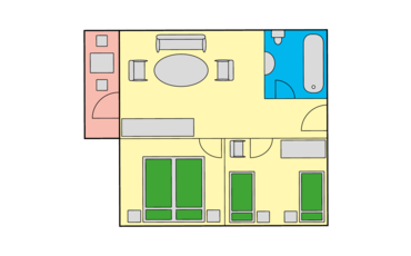 Für Großfamilien bieten wir ein Appartement mit 2 Schlafzimmern, Wohnzimmer, Bad/WC, Fön, Telefon, Radio, Kabel-TV, WLAN, Safe, Minibar und Balkon an.